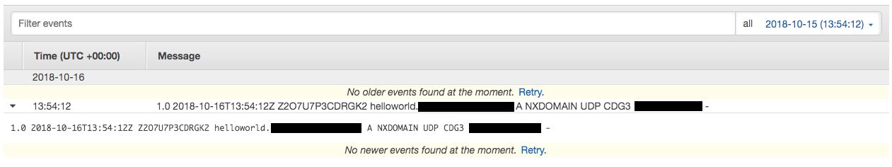 When you look at the logs in CloudWatch you can then search by the subdomain to identify data you just started exfiltrating. There is a lot of potential with this type of logging to automate breaking a file into a series of DNS queries and using the logs to reassemble the file.