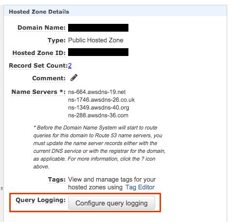 If you don't have an AWS account, you can create one for free but sadly Route 53 is not part of the free tier so a hosted zone is going to cost $0.50/month. Once the account is created search for the Route 53 service and create a public hosted zone with your domain name. If you wish to use a subdomain, you can specify that instead and configure the parent domain with nameservers to delegate that subdomain. Once created select the new hosted zone and under the details pane select configure query logging.