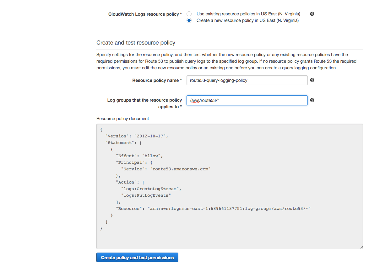 A guide will walk you through configuring logging by first choosing a log group. I would recommend using what is suggested "/aws/route53/<domain>". Next you will setup a policy to provide access to the log group you just created. Again I would recommend just using the suggested defaults.