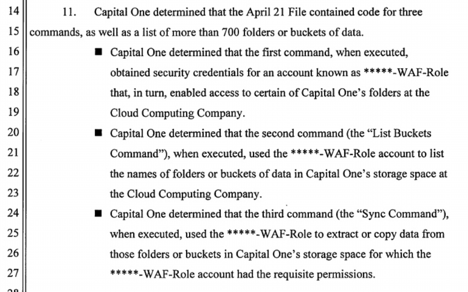 As more details about the Capital One breach are released in court filings and media reporting, we can start to look at where controls failed to prevent this breach and what lessons companies working in AWS can take away from this event. Based on initial court filings, the alleged attacker utilized three commands to access the Capital One data. This summary on (page 6, line 14) of the DOJ complaint has been reported in the media as a trivial attack but based on the wording indicates something more complex.