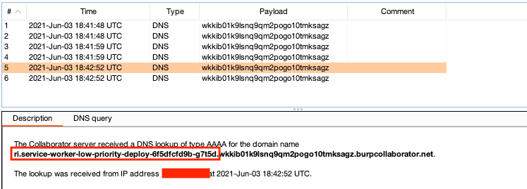 I tried the Gem::Requirement gadget chain with the nslookup and curl command to Burp collaborator but didn't receive any DNS lookup. As the first chain didn't work, the next gadget chain Gem::Installer was tried with the same commands. Again no DNS lookup came back.