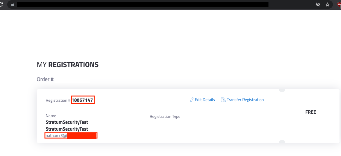 Using the public registration link, I registered an account with my own email address. After submitting the registration form, the user will be redirected to a webpage containing the password for the account known as the registration number.
