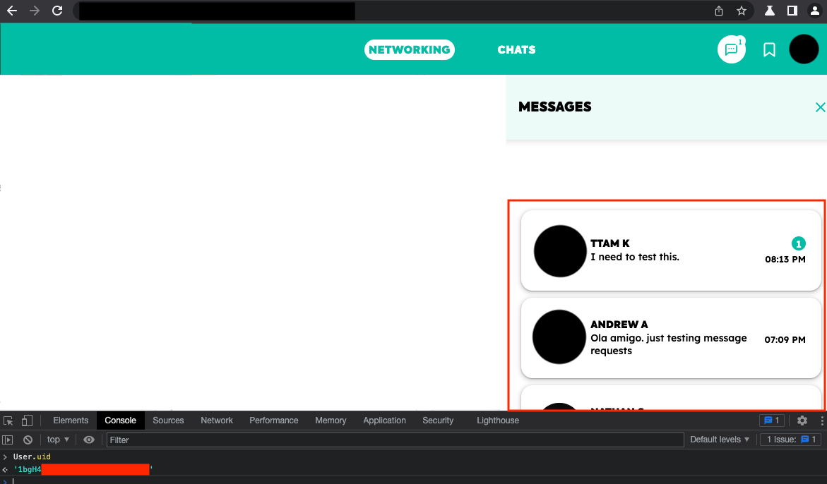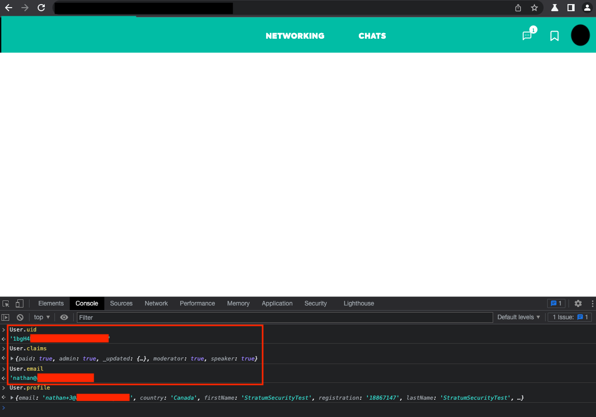 Logging into the application with that account and visiting a Networking page lists all the users. Looking at the JSON data from the web server revealed the user's email address, their user ID, and roles.