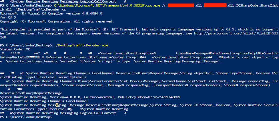 Compiling and executing the PoC returned a response with a stack trace revealing the BinaryServerFormatterSink class being used: